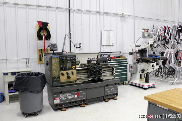 裝有車架夾具的重焊接站等待著承接下一個項目。在它下面,則是一張巨大的車床。