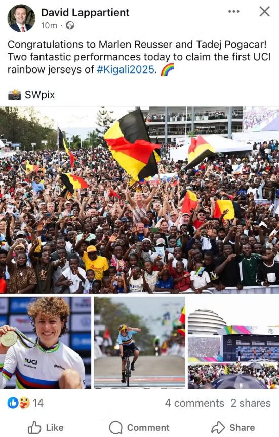 在盧旺達(dá)基加利舉行的2025年UCI公路自行車世錦賽上,誒菲內(nèi)普爾與馬琳·羅伊瑟分別稱雄男女子個(gè)人計(jì)時(shí)賽。然而賽后UCI主席大衛(wèi)·拉帕蒂安在社交媒體賬號(hào)發(fā)布的賀文中,卻將男子組冠軍錯(cuò)寫為波加查。眼尖的車迷迅速截圖傳播,使這條存在關(guān)鍵錯(cuò)誤的貼文引發(fā)軒然大波。