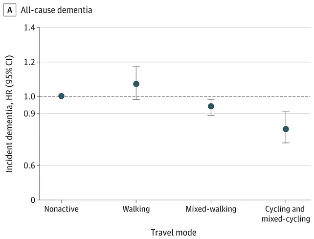 研究團(tuán)隊(duì)發(fā)現(xiàn),經(jīng)常騎自行車(不含通勤騎行)的人群患癡呆癥的風(fēng)險低于步行、駕車或使用公共交通者:他們患全因癡呆癥的可能性低19%,患阿爾茨海默病的風(fēng)險低22%。
