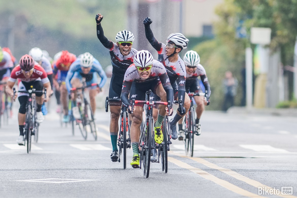 比賽很快就進行到了第七圈,最后3公里彎道眾多,而最后300米的直角彎則是每只車隊最后爭奪的“關(guān)鍵點”。凱路仕-烈風車隊的三名隊員夏威、朱梵心、黃暖堂率先切入急彎,夏威處在集團最前方。最后300米,最后的大集團沖刺,凱路仕·烈風車隊的三名隊員以較大的差距搶得先機,三名隊員同時發(fā)力,前三甲手到擒來!他們振臂高呼,慶祝這完美的結(jié)局!