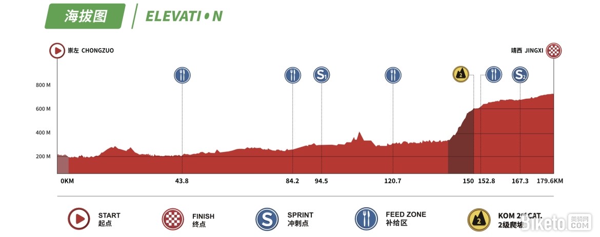 2025庫(kù)迪咖啡-環(huán)廣西世巡賽第二賽段崇左—靖西賽段,路線由海濱風(fēng)光逐步過渡至山地地貌,比賽從具有“中國(guó)邊關(guān)風(fēng)情”特色的崇左九牛爬坡廣場(chǎng)出發(fā),騎往素有“山水邊城”美譽(yù)的百色靖西。由于受到自然災(zāi)害影響,本賽段競(jìng)賽距離由原先179.6公里縮短至177.3公里,比賽起終點(diǎn)分別設(shè)于崇左市的九牛爬坡廣場(chǎng)和靖西的錦繡古鎮(zhèn),在92.2公里及165公里處設(shè)2個(gè)途中沖刺點(diǎn),在148公里處1個(gè)二級(jí)爬坡點(diǎn),該爬坡累計(jì)爬升336米,平均坡度為3.6%。