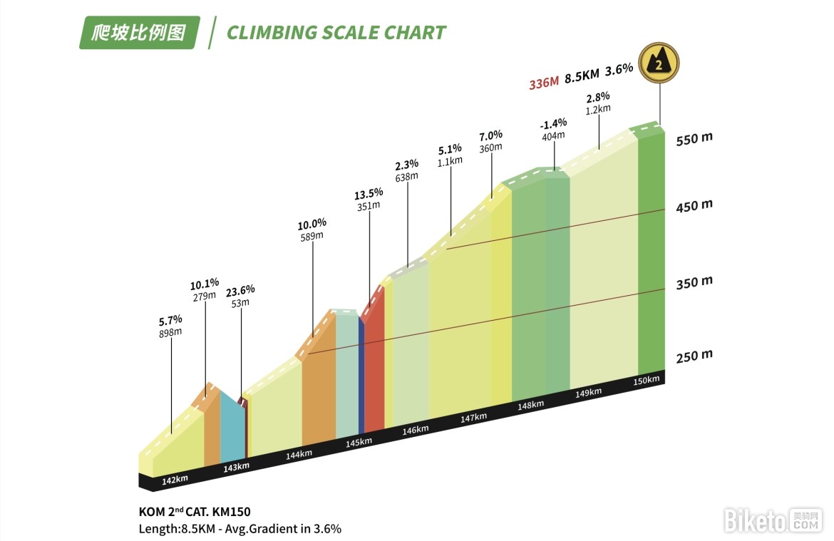 2級(jí)爬坡點(diǎn)累計(jì)爬升336米,其中包含4段超10%的爬坡路段,其中23.6%的短陡坡和連續(xù)10%的爬坡十分考驗(yàn)車手對(duì)整體爬坡節(jié)奏的把控。