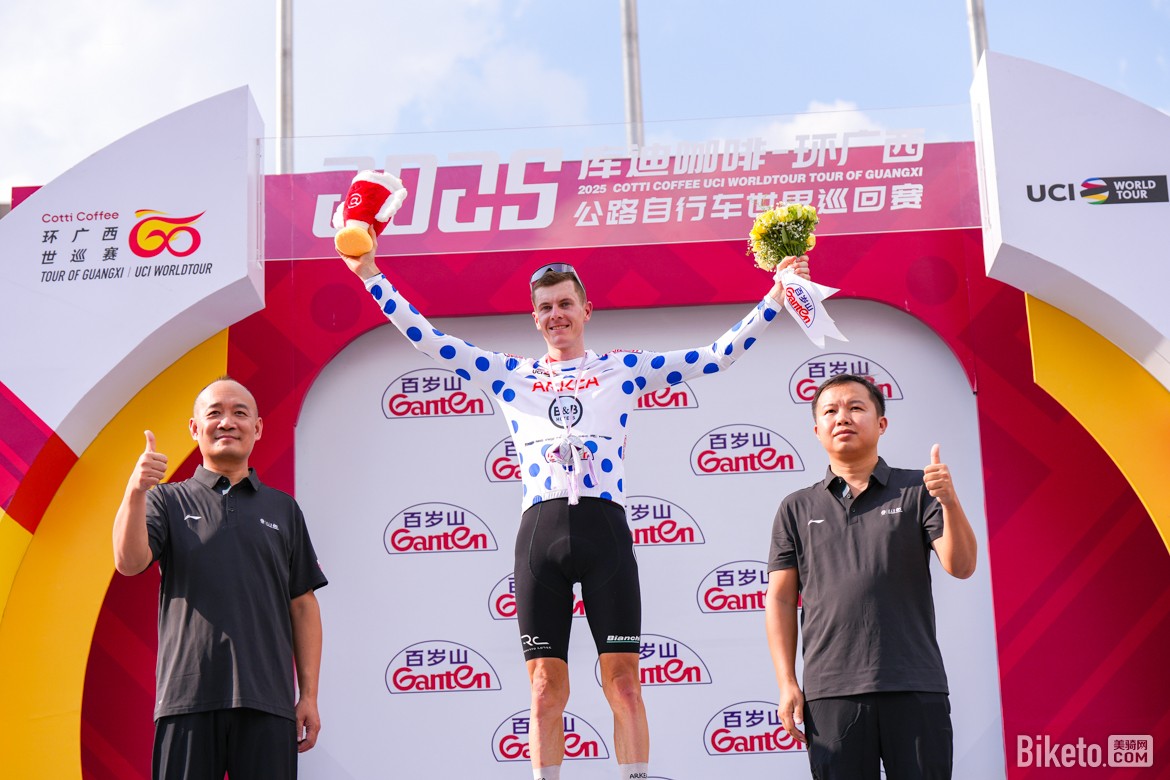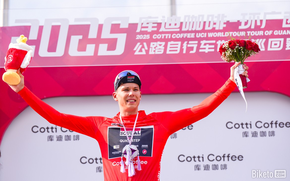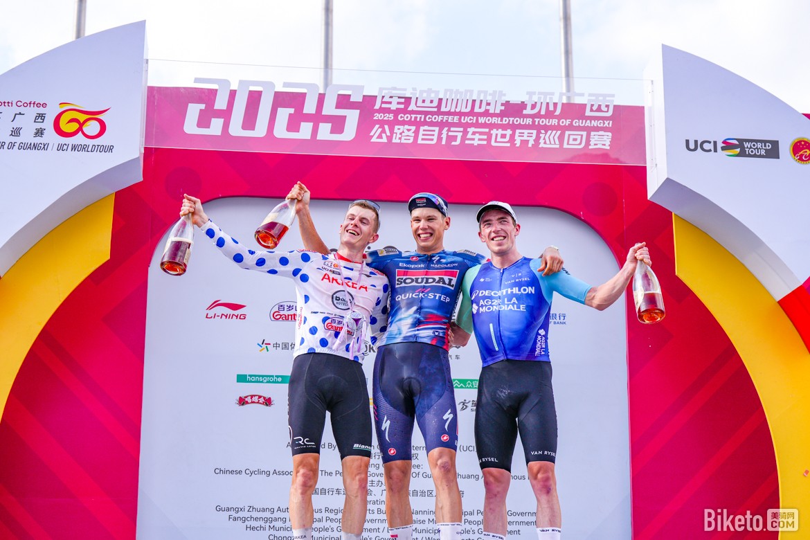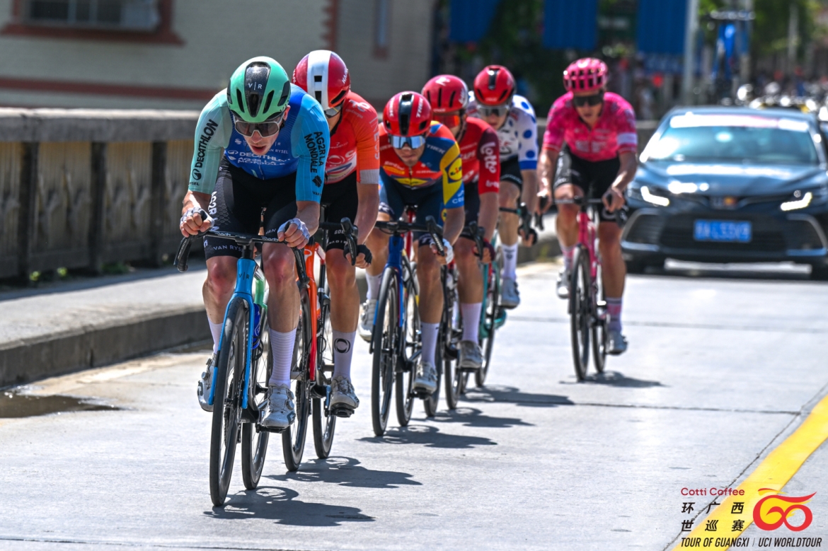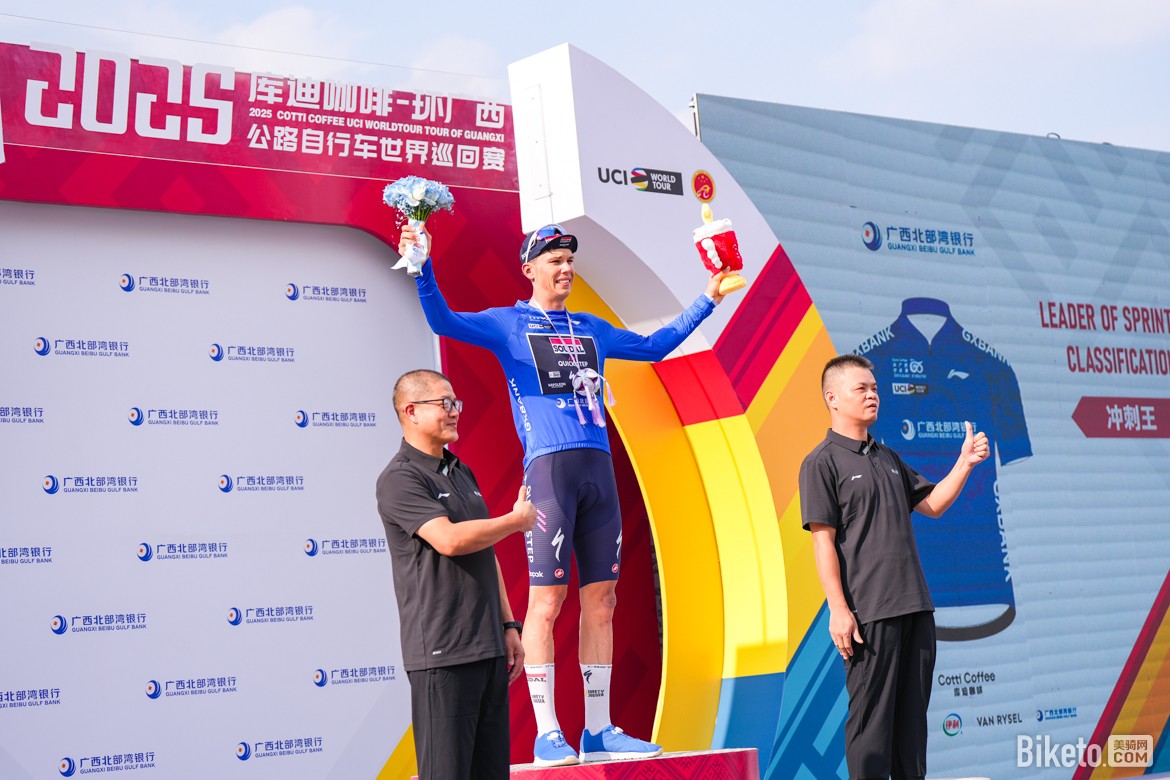 馬尼耶憑借連續(xù)四場(chǎng)賽段勝利,繼續(xù)身披象征個(gè)人總成績(jī)領(lǐng)先的“庫迪咖啡”紅色領(lǐng)騎衫、沖刺積分領(lǐng)先的“廣西北部灣銀行”藍(lán)色領(lǐng)騎衫,以及青年最佳的“李寧”白色領(lǐng)騎衫。阿爾凱亞-B&B酒店車隊(duì)的西蒙·居列爾米(Simon Guglielmi)繼續(xù)保有象征爬坡王的“百歲山”圓點(diǎn)衫;迪卡儂AG2R車隊(duì)的斯坦·德伍爾夫(Stan Dewulf)憑借積極突圍獲得本賽段敢斗獎(jiǎng)。