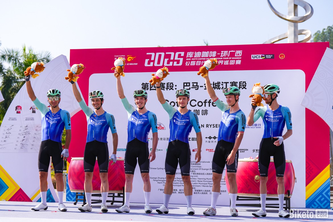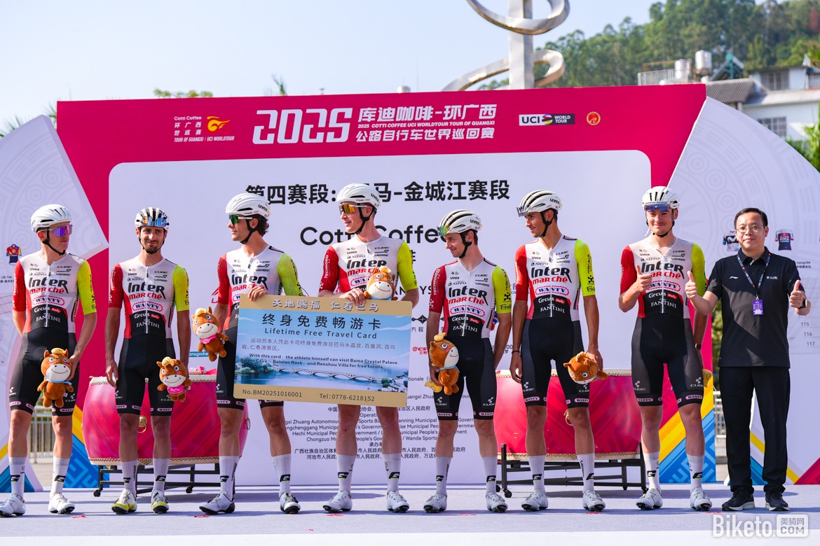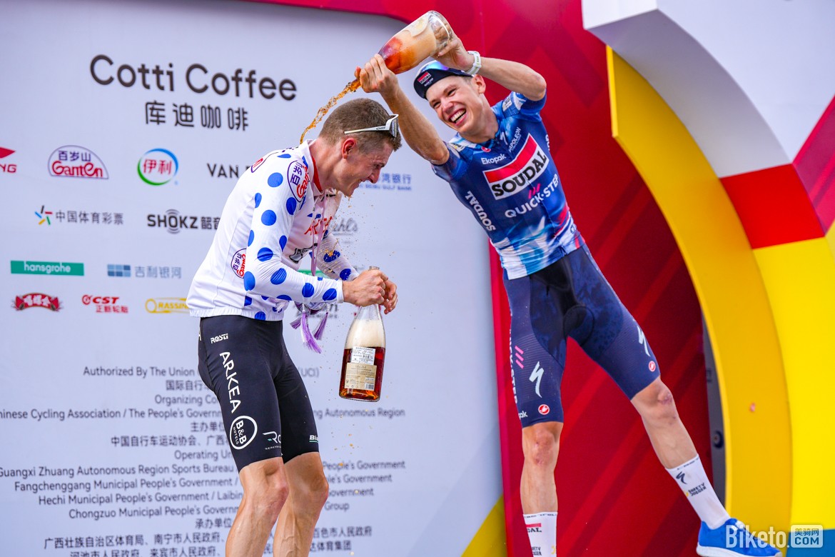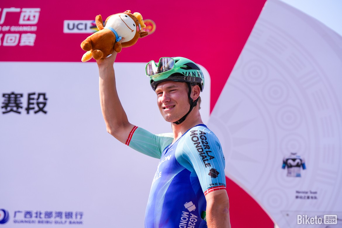 馬尼耶憑借連續(xù)四場(chǎng)賽段勝利,繼續(xù)身披象征個(gè)人總成績(jī)領(lǐng)先的“庫迪咖啡”紅色領(lǐng)騎衫、沖刺積分領(lǐng)先的“廣西北部灣銀行”藍(lán)色領(lǐng)騎衫,以及青年最佳的“李寧”白色領(lǐng)騎衫。阿爾凱亞-B&B酒店車隊(duì)的西蒙·居列爾米(Simon Guglielmi)繼續(xù)保有象征爬坡王的“百歲山”圓點(diǎn)衫;迪卡儂AG2R車隊(duì)的斯坦·德伍爾夫(Stan Dewulf)憑借積極突圍獲得本賽段敢斗獎(jiǎng)。