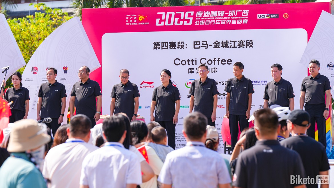 上午10點(diǎn)50分,第四賽段發(fā)車儀式在巴馬壽鄉(xiāng)文化廣場(chǎng)舉行。廣西壯族自治區(qū)河池市委常委、宣傳部部長(zhǎng)孔獻(xiàn)玲,廣西壯族自治區(qū)工商聯(lián)副主席覃定堅(jiān),廣西壯族自治區(qū)體育局副局長(zhǎng)梁劍波,廣西壯族自治區(qū)黨委網(wǎng)信辦二級(jí)巡視員徐顥文,中直機(jī)關(guān)駐桂代表、二級(jí)巡視員鄧明捷,廣西壯族自治區(qū)河池市政協(xié)副主席韋祖林,廣西壯族自治區(qū)河池市巴馬瑤族自治縣縣長(zhǎng)余浩學(xué),萬達(dá)體育集團(tuán)副總裁高賓,庫迪咖啡廣西區(qū)域總監(jiān)任丹丹等領(lǐng)導(dǎo)和嘉賓出席儀式。韋祖林致歡迎辭,孔獻(xiàn)玲宣布開賽。