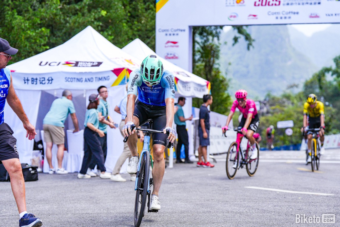 終點(diǎn)前3公里,蘇浩鈺率先發(fā)力,嘗試脫離突圍小組,但很快就被身后車手追上。而此時身處大集團(tuán)的保羅·馬尼耶(Paul Magnier)開始掉隊。隨后,來自杰科-埃爾奧拉車隊的保羅·達(dá)博(Paul Double)在通過“中國弄拉”景區(qū)牌坊后便單飛進(jìn)攻,而在他身后的阿聯(lián)酋航空-XRG車隊的約納坦·納瓦埃茲(Jhonatan Narváez)等其他車手,雖然奮力發(fā)起追擊,但始終無法縮小差距。最終,保羅·達(dá)博(Paul Double)率先通過終點(diǎn),贏下2025庫迪咖啡-環(huán)廣西世巡賽的“皇后賽段”。迪卡儂AG2R車隊的維克托·拉菲(Victor Lafay),和英孚教育易郵車隊的米克爾·奧諾雷(Mikkel Frølich Honoré)獲得第二、第三名。