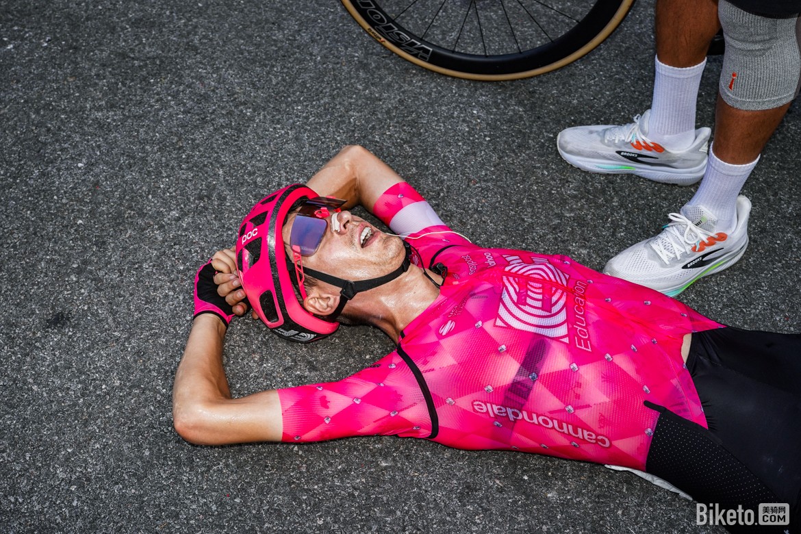 ▲英孚教育易郵車隊的米克爾·奧諾雷(Mikkel Frølich Honoré)已經(jīng)耗盡直接累倒在地