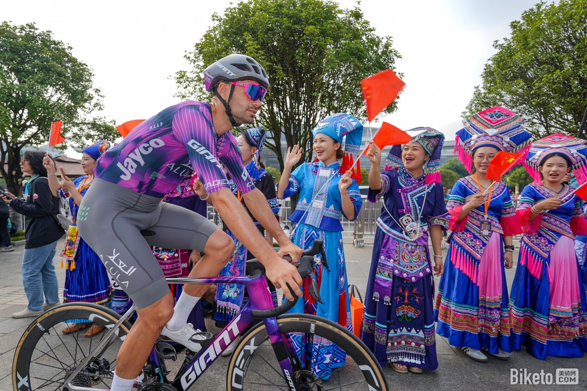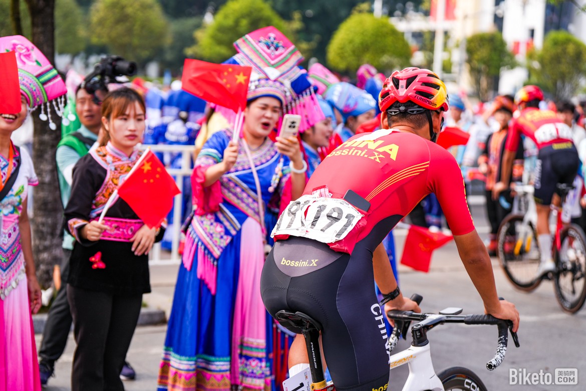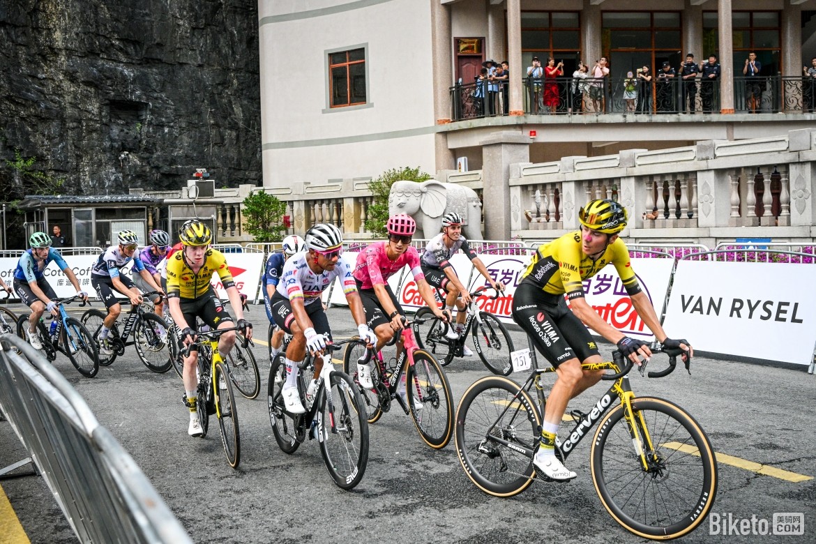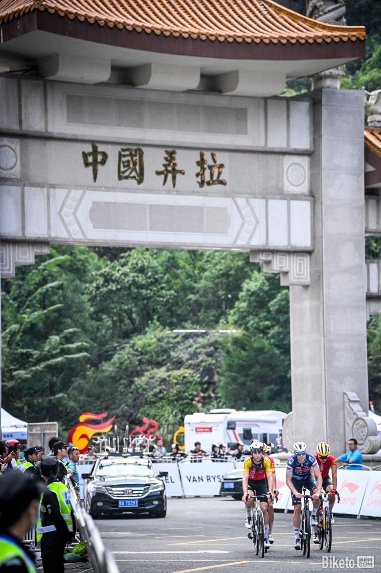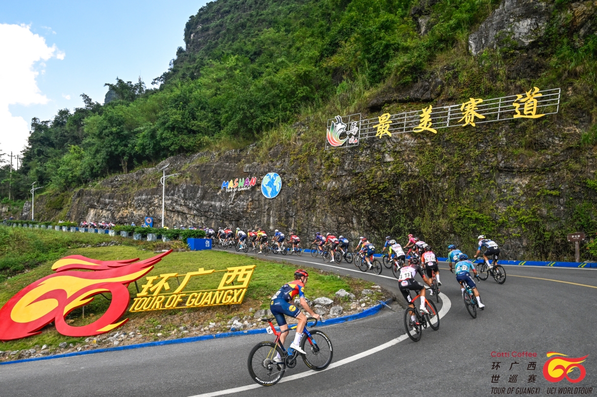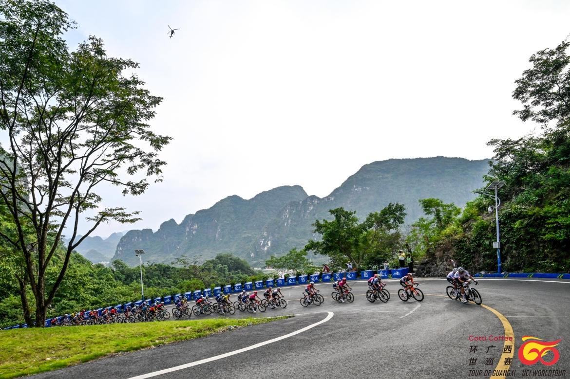 完成第二個途中沖刺點(diǎn)后,車手們開始向馬山縣弄拉景區(qū)進(jìn)發(fā),比賽迎來最激動人心的決勝時刻。此時,杰科-埃爾奧拉車隊、阿聯(lián)酋航空-XRG車隊以及阿爾凱亞-B&B車隊的車手紛紛在大集團(tuán)前方領(lǐng)騎追擊,進(jìn)入馬山弄拉景區(qū)爬坡路段時,領(lǐng)先車手與大集團(tuán)之間的時間差被縮短至1分鐘以內(nèi)。