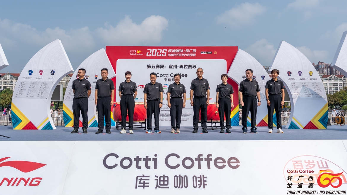 上午10點(diǎn)50分,第五賽段發(fā)車儀式在河池市宜州區(qū)河池市中心廣場舉行。廣西壯族自治區(qū)河池市人民政府副市長翟紅玲,中國鐵路南寧局集團(tuán)有限公司副總經(jīng)理賈順勇,廣西壯族自治區(qū)農(nóng)業(yè)農(nóng)村廳二級巡視員黃庭軍,廣西壯族自治區(qū)林業(yè)局二級巡視員蔣迎紅,中國移動廣西公司副總經(jīng)理何玲,廣西壯族自治區(qū)河池市政協(xié)副主席韋祖林,廣西壯族自治區(qū)河池市宜州區(qū)人民政府區(qū)長戚嘯,萬達(dá)體育集團(tuán)總裁張梅及庫迪咖啡廣西區(qū)域總監(jiān)周勇波等領(lǐng)導(dǎo)和嘉賓出席發(fā)車儀式。韋祖林致歡迎辭,翟紅玲宣布開賽。