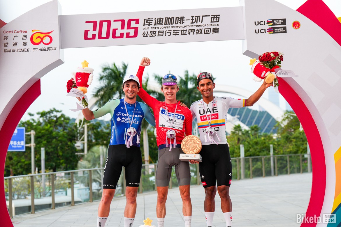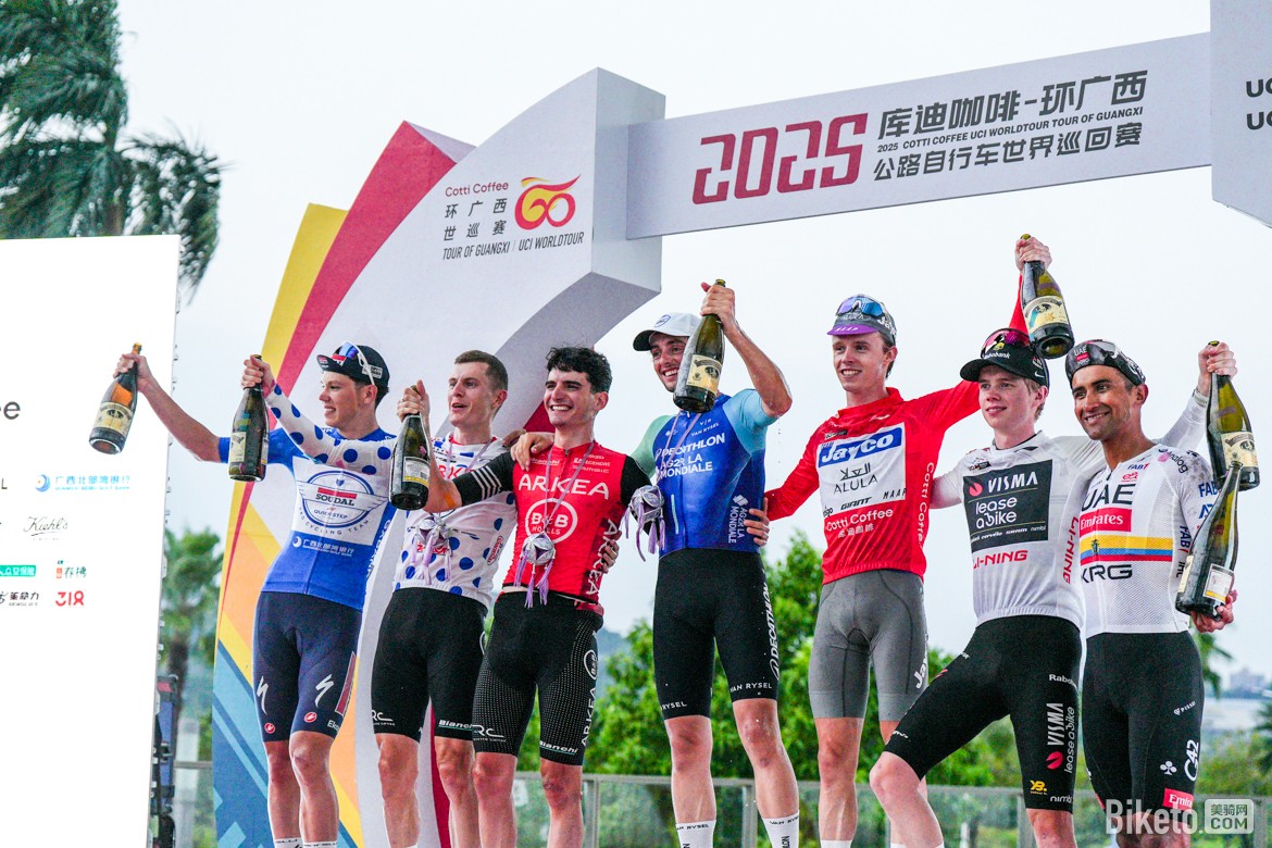 隨著南寧城市賽段落下帷幕,各色榮譽(yù)衫的歸屬全部塵埃落定:杰科-埃爾奧拉車隊(duì)的保羅·達(dá)博(Paul Double)憑借在弄拉皇后賽段的卓越表現(xiàn),最終奪得象征總成績(jī)冠軍的“庫(kù)迪咖啡”紅色領(lǐng)騎衫;豪取五勝的速的奧-快步車隊(duì)的保羅·馬尼耶(Paul Magnier)憑借絕對(duì)的沖刺能力捍衛(wèi)了象征沖刺王的“廣西北部灣銀行”藍(lán)色領(lǐng)騎衫;阿爾凱亞-B&B酒店車隊(duì)的西蒙·居列爾米(Simon Guglielmi)獲得象征爬坡王的“百歲山”圓點(diǎn)衫;維斯瑪車隊(duì)的約爾根·諾德哈根(Jørgen Nordhagen)則奪得象征青年最佳的“李寧”白色領(lǐng)騎衫;維斯瑪-麗思拜克車隊(duì)收獲最佳車隊(duì)榮譽(yù)。此外,迪卡儂AG2R車隊(duì)的維克托·拉菲(Victor Lafay)和阿聯(lián)酋航空-XRG車隊(duì)的約納坦·納瓦埃茲(Jhonatan Narváez)分獲總成績(jī)二、三名。