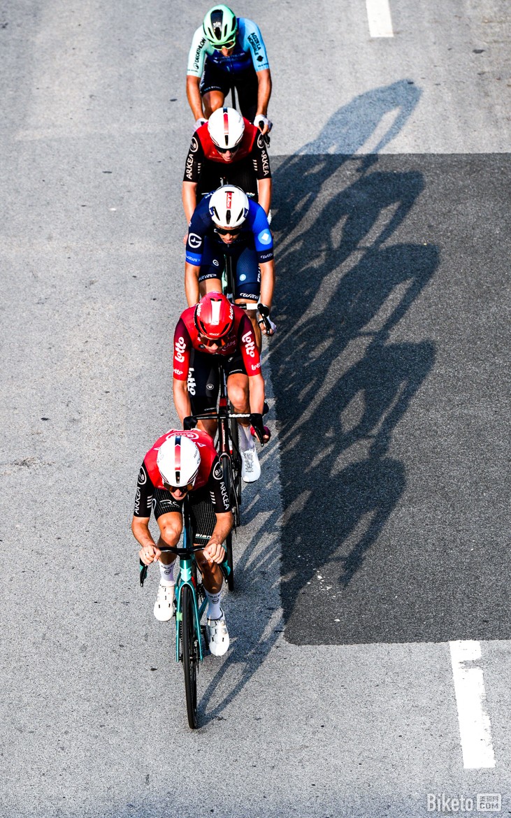 開(kāi)賽5公里,來(lái)自樂(lè)透車隊(duì)的魯本·湯普森(Reuben Thompson)、阿爾凱亞-B&B酒店車隊(duì)的萊昂德雷·洛祖埃(Léandre Lozouet)、迪卡儂AG2R車隊(duì)的南斯·彼得斯(Nans Peters)、安盟FDJ車隊(duì)的克萊芒·達(dá)維(Clément Davy)以及科菲迪斯車隊(duì)的揚(yáng)·馬斯(Jan Maas)便率先從大團(tuán)中突出,試圖爭(zhēng)奪第一個(gè)爬坡點(diǎn)。經(jīng)過(guò)激烈的比拼,魯本·湯普森、萊昂德雷·洛祖埃、南斯·彼得斯拿下第一個(gè)爬坡點(diǎn)的前三名。至此,阿爾凱亞-B&B酒店車隊(duì)的西蒙·居列爾米(Simon Guglielmi)已提前鎖定了象征爬坡王的“百歲山”圓點(diǎn)衫。