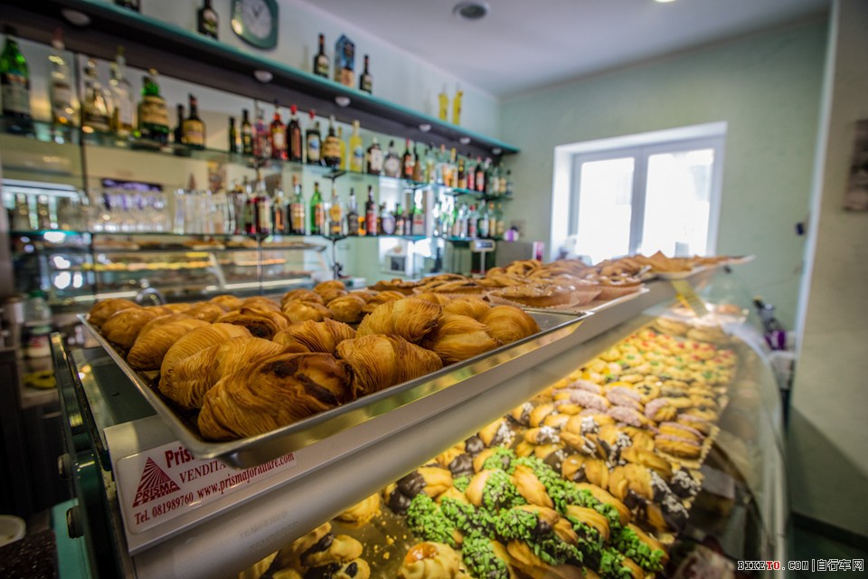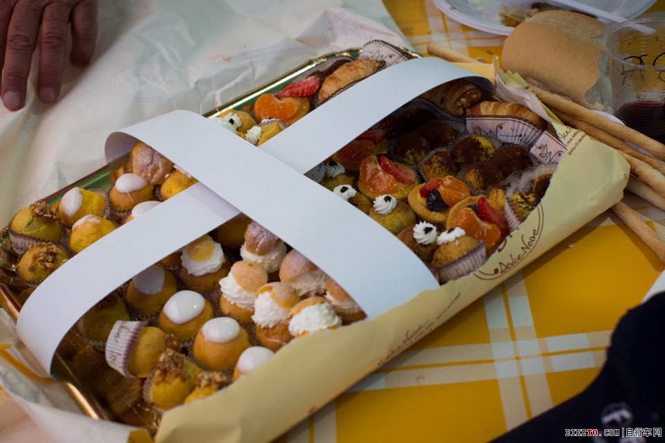 一個典型的清早的情景:在計時賽段中當地酒吧提供的各式糕點!皊fogliatelle”是一種在意大利十分流行的糕點。