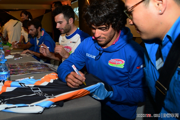 10月9日下午,美利達-藍波車隊在北京懷柔益田影人花園酒店舉行中國車迷見面會,為車隊即將參加環(huán)京賽打氣造勢。車隊運動總監(jiān)Joxean Matxin和Sandro Lerici陪同著名沖刺手Roberto Ferrari以及Matteo Bono、Davide Cimolai等8位即將參加環(huán)京賽的車手出席了見面會,為車友現(xiàn)場簽名并與其合影。數(shù)十位美利達-藍波車隊的粉絲參加了見面會,車手們也一一回應了粉絲們的熱情。